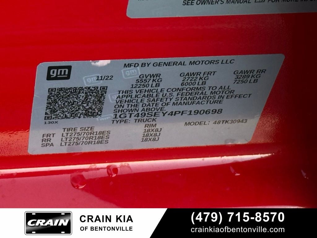 10-Speed Automatic, 4WD, Black Cloth, 120-Volt Bed Mounted Power Outlet, 120-Volt Instrument Panel Power Outlet, 2-Speed Electronic Shift Transfer Case, 220 Amp Alternator, 3 Years of OnStar & Connected Services Plan, 4-Way Manual Driver Seat Adjuster, 4-Way Manual Passenger Seat Adjuster, 4-Wheel Disc Brakes, 6 Speakers, 6-Speaker Audio System Feature, ABS brakes, Air Conditioning, AM/FM radio, Apple CarPlay/Android Auto, Auto-Dimming Inside Rear-View Mirror, Black Assist Step (LPO), Brake assist, Bumpers: chrome, Chrome Surround Grille w/Black Mesh, Compass Located In Instrument Cluster, Convenience Package, Deep-Tinted Glass, Delay-off headlights, Driver door bin, Dual front impact airbags, Dual front side impact airbags, Electric Rear-Window Defogger, Electronic Stability Control, Engine Block Heater, Exhaust Brake, EZ Lift Power Lock & Release Tailgate, Front 40/20/40 Split-Bench Seats, Front anti-roll bar, Front Center Armrest w/Storage, Front License Plate Kit, Front reading lights, Front wheel independent suspension, Fully automatic headlights, GMC Connected Access Capable, Heavy Duty Front Spring/Camper Package, Heavy-Duty 80 Amp Battery, High Idle Switch, Integrated Trailer Brake Controller, LED Cargo Area Lighting, Low tire pressure warning, Occupant sensing airbag, OnStar & GMC Connected Services Capable, Outside Power-Adjustable Black Mirrors, Outside temperature display, Overhead airbag, Overhead console, Passenger door bin, Passenger vanity mirror, Perimeter Lighting, Pickup Bed, Power Rear Windows w/Express Down, Power steering, Power windows, Power-Adjustable Vertical Trailering Mirrors, Preferred Equipment Group 1SA, Premium audio system: GMC Infotainment System, Radio: AM/FM w/GMC Infotainment System, Rear reading lights, Rear step bumper, Remote Keyless Entry, SiriusXM Radio, Solar Absorbing Tinted Glass, Split folding rear seat, Steering Wheel-Mounted Cruise Control, Suspension Package, Tachometer, Tilt steering wheel, Traction control, Trip computer, Upfitter Switch Kit (5), Variably intermittent wipers, Vinyl Seat Trim, Voltmeter, Wi-Fi Hotspot Capable, Winter Grille Cover.